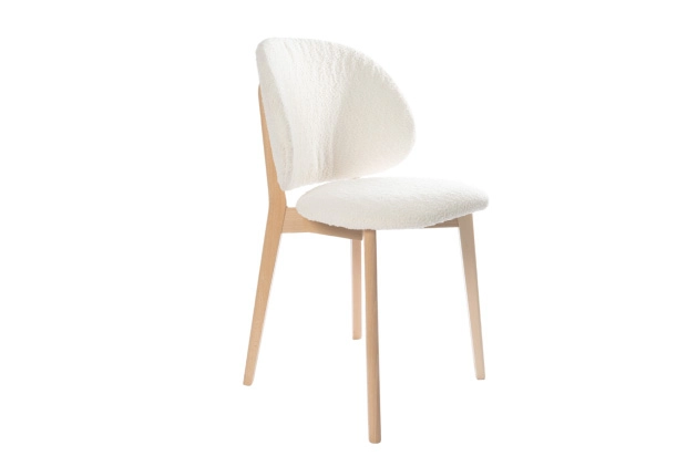 Krzesło to wykonane jest z trwałego drewna bukowego, które bejcowane jest na wybrany przez Klienta kolor. Miękkie siedzisko pokryte jest wysokiej jakości gąbką i obłożone przyjemną tkaniną w wybranym kolorze. Komfort użytkowania utrzymany jest na najwyższym poziomie dzięki wygodnemu siedzisku, ale równie komfortowym oparciu.