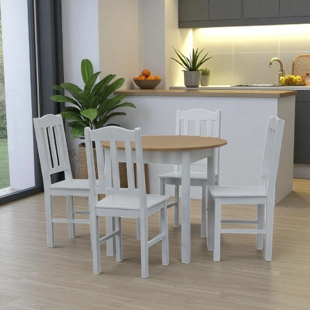 Szukasz praktycznego i stylowego kompletu mebli do jadalni lub kuchni? Zestaw okrągły stół ST35 z krzesłami drewnianymi model 12 to połączenie funkcjonalności, solidnego wykonania i ponadczasowego designu. Idealnie sprawdzi się we wnętrzach urządzonych w stylu skandynawskim, nowoczesnym i minimalistycznym.