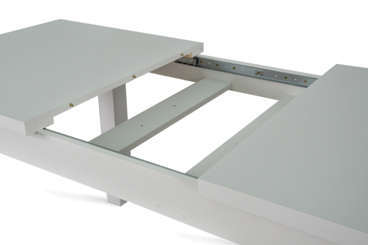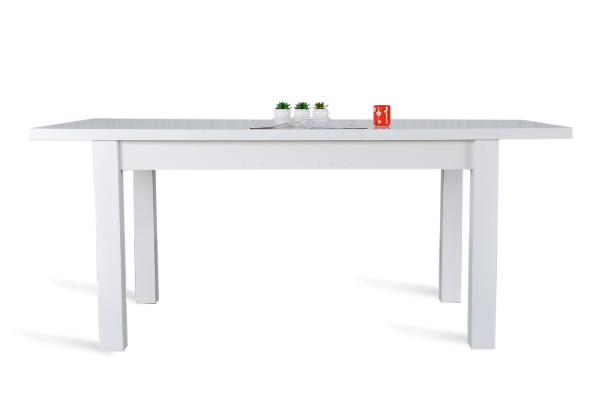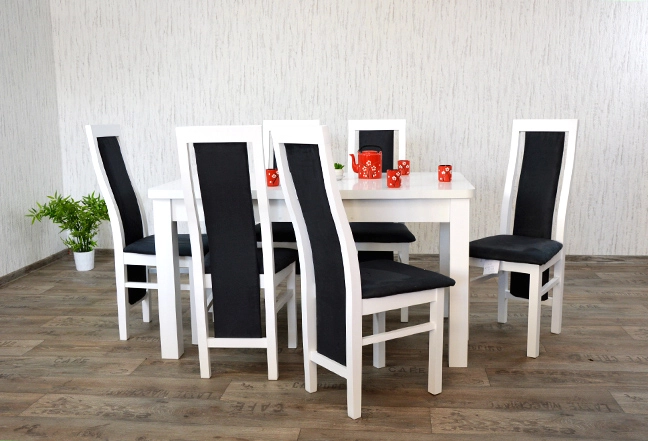 Przedstawiony tutaj zestaw mebli pokojowych to oferta, która przypadnie do gustu szczególnie osobom, poszukującym nietuzinkowych i eleganckich rozwiązań wnętrzarskich. Stół z prostokątnym blatem o wymiarach 80 x 140 cm, który dzięki specjalnej konstrukcji opartej na łożyskowanych prowadnicach o wkładkach można przedłużyć do 180 cm. Uzupełnia go sześć eleganckich krzeseł z tapicerowanym oparciem i siedziskiem.