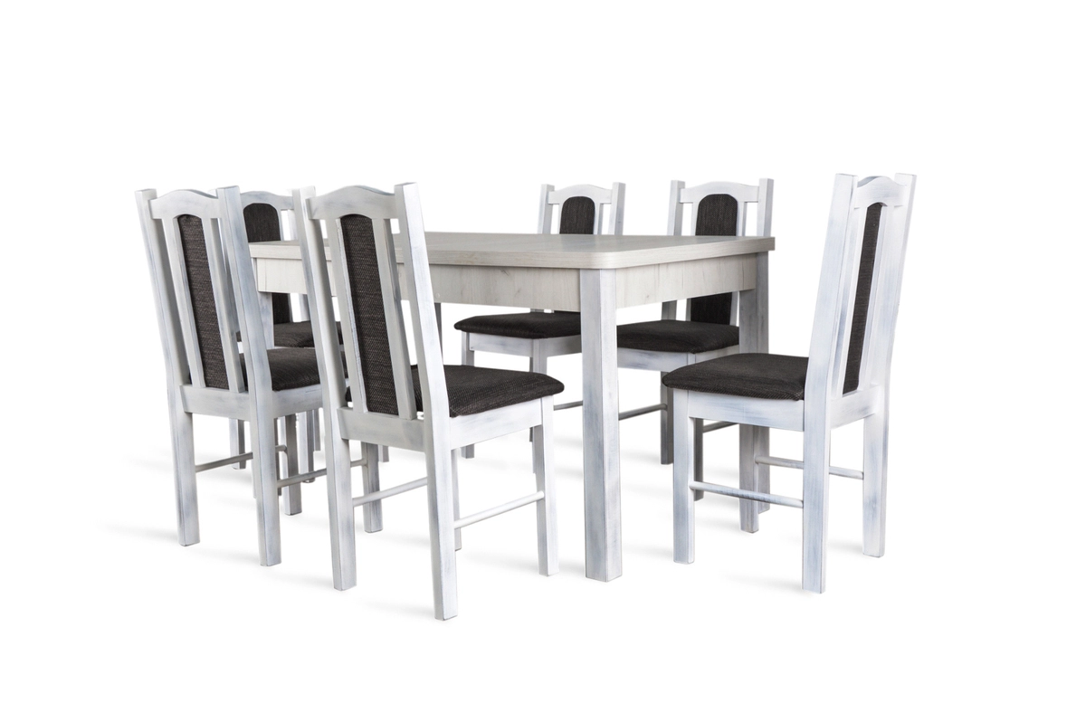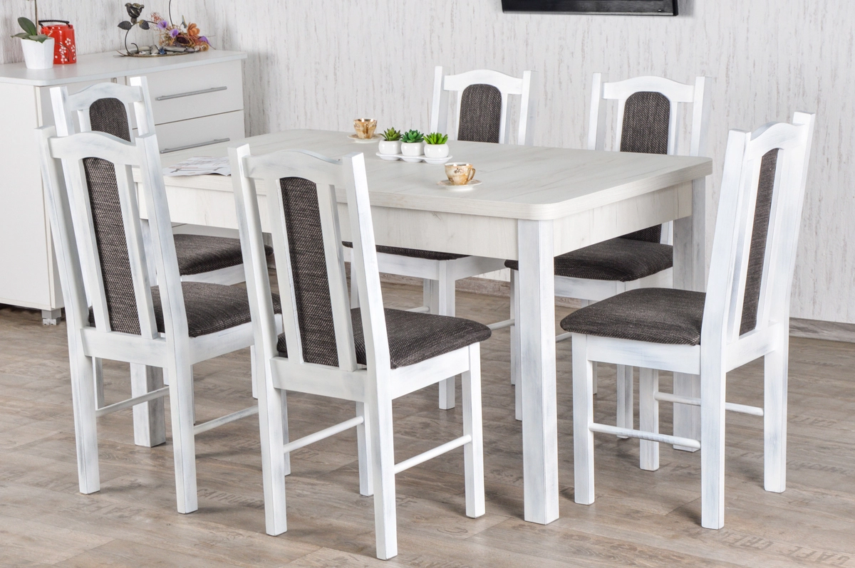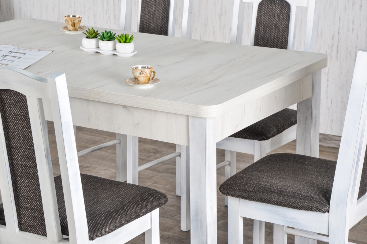 Zestaw który idealnie sprawdzi się w jadalni lub salonie urządzonych w klasycznym lub eklektycznym. Stylistyka stołu jest bardzo prosta i lekka, dzięki czemu przestrzeń w której się znajdzie nie zostanie nim zdominowana. Udało się to uzyskać bez poświęcenia funkcjonalności - wygodny mechanizm rozkładania stołu pozwala w kilka chwil powiększyć go aż do 180 centymetrów. Idealnie na rodzinne okazje i dla niespodziewanych gości! W komplecie znajduje się 6 krzeseł model 3, naszej najbardziej dopracowanej i niezniszczalnej konstrukcji. Krzesła są tapicerowane z miękkim siedziskiem, co zapewnia niesamowity komfort i wygodę.