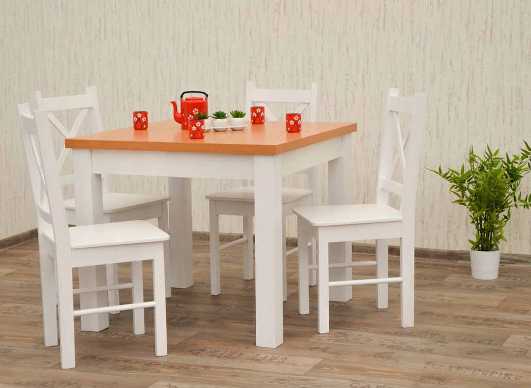 Prezentowany zestaw stół z krzesłami będzie praktyczny w każdej kuchni. Sprawdzi się w kompaktowych przestrzeniach, gdzie na co dzień nie ma miejsca na mebel z dużym blatem. Stół ST41 oferujemy w dwóch wariantach: nierozkładany i rozkładany do 190cm. W obu wersjach blat stołu został wykonany z trwałej płyty melaminowanej, która jest trwała oraz łatwa w pielęgnacji. Nogi stołowe zostały wykonane z twardego drewna bukowego, malowane naturalnymi bejcami wodnymi. Do kompletu ze stołem oferujemy 4 krzesła drewniane model 79T, które są ulubionymi krzesłami kuchennymi naszych Klientów. Prosta i jednocześnie niebanalna forma krzesła będzie idealna do wnętrz w stylu skandynawskim czy minimalistycznym. Krzesła w całości wykonane są z drewna bukowego, wykończone naturalnymi farbami, lakierami na bazie wody.