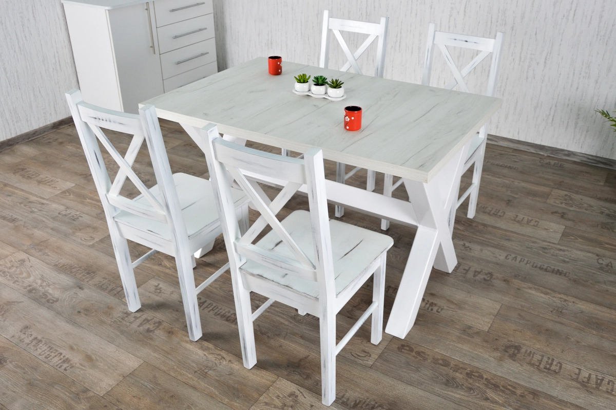 Prezentowany stół i krzesła do kuchni to meble o niezwykle stabilnej konstrukcji, wyróżniające się estetycznym wykonaniem, ponadczasową trwałości i wysokim poziomem oferowanej wygody użytkowej. Krzesła wchodzące w skład zestawu zostały wykonane z naturalnego drewna bukowego malowanego ekologicznymi bejcami wodnymi. Blat stołu o konstrukcji stalowej został wykonany z trwałej płyty melaminowanej odpornej na blaknięcie, zarysowania czy wilgoć. W ofercie naszego sklepu znajdą Państwo również inne stoły i krzesła do jadalni, kuchni czy salonu. Zachęcamy do zapoznania się z całością naszej oferty.