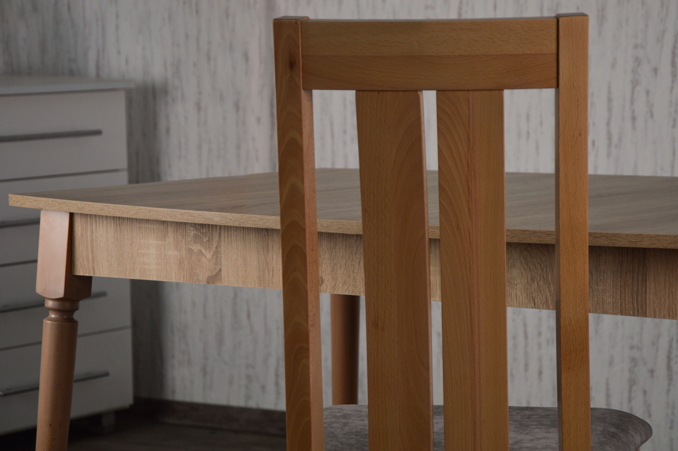 Ważny jest też wybór płyty, z której wykonany zostanie stół. Co jest lepsze płyta melaminowana czy okleina naturalna. Nie ma jednej prawdziwej odpowiedzi. Płyta melaminowana jest tańsza, a okleina naturalna jest droższa. W związku z tym, jeżeli potrzebujesz mebla do kuchni lub jadalni, gdzie będzie intesywnie eksploatowany przez domowników, w tym dzieci, stół z płyty melaminowanej spełni swoje zadanie. Jeżeli potrzebujesz mebla reprezentacyjnego to tylko i wyłącznie płyta w okleinie naturalnej wykończona lakierami w półmacie lub połysku. Lakiery te nadają bardzo dużą twardość powierzchni i piękny wygląd drewna. Wybór kształtu stołu to sprawa indywidualna. Ważniejszy jest jednak kształt nogi stołu. Tutaj kierujemy się prostą zasadą: noga przy stole powinna mieć taki sam kształt jak przednia noga krzesła. Jak w przypadku każdej reguły są od niej oczywiście odstępstwa.